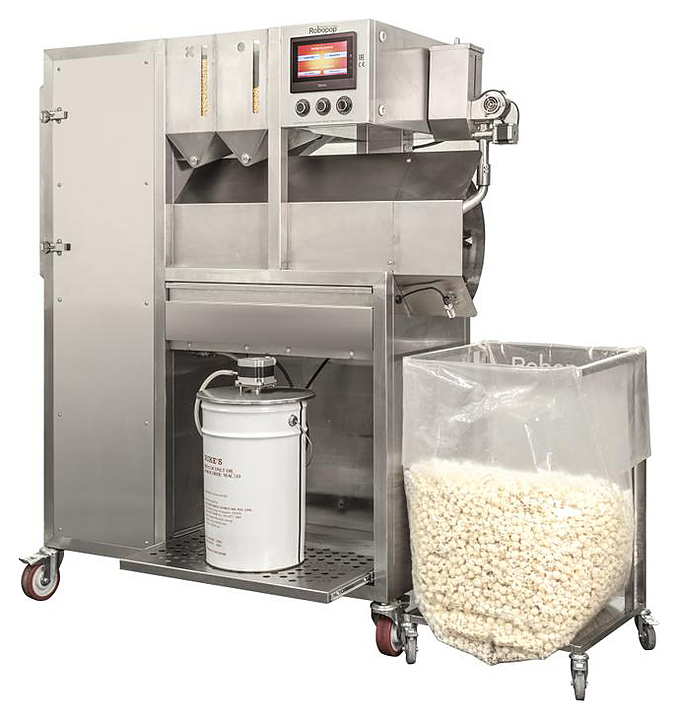 Аппарат для попкорна RoboLabs Robopop 60 предназначен для раскрытия кукурузного зерна при помощи горячего воздуха на предприятиях пищевой промышленности. Распределение зерна по параболическому дну чаши рабочей камеры происходит равномерным слоем. Зерно постоянно находится в движении вокруг оси чаши, перемешивается и равномерно прогревается. Благодаря вихревому воздушному потоку внутри камеры, раскрывшиеся зерна немедленно удаляются из горячей зоны, что благотворно сказывается на качестве и вкусе попкорна.