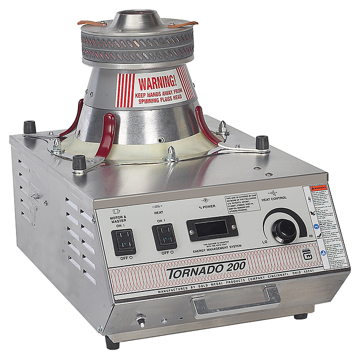 Аппарат для сахарной ваты Gold Medal Tornado 200 используется в уличных кафе, кинотеатрах и развлекательных центрах. Оборудование оснащено нагревательной спиралью. Корпус выполнен из нержавеющей стали, ловитель - из алюминия.