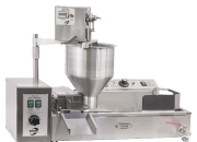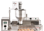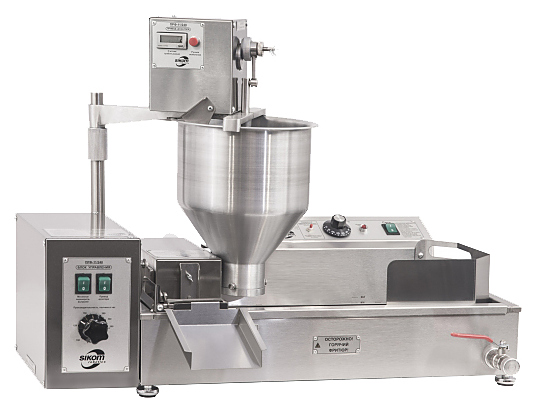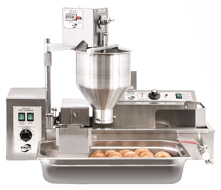 Пончиковый аппарат Sikom ПРФ-11/240 используется на предприятиях общественного питания и торговли. Оборудование в автоматическом режиме формует тестовую заготовку, отсаживает ее во фритюрную ванну, обжаривает по очереди с 2 сторон и выгружает из ванны готовый пончик. Благодаря плунжерным парам возможно изготовление пончиков различных размеров.