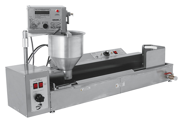 Пончиковый аппарат Sikom ПРФ-11/900D (D36) используется на предприятиях общественного питания и торговли. Оборудование в автоматическом режиме формует тестовую заготовку, отсаживает ее во фритюрную ванну, обжаривает по очереди с 2 сторон и выгружает из ванны готовый пончик. Модель оснащена плунжерной парой, позволяющей изготавливать пончики одного диаметра. Корпус выполнен из высококачественной нержавеющей стали, делитель-дозатор из пищевого алюминиевого сплава.