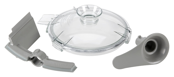 В комплект поставки входят чаша с эргономичной ручкой, нож со съёмным колпачком для очистки, крышка и разборный из 2х частей скребок.