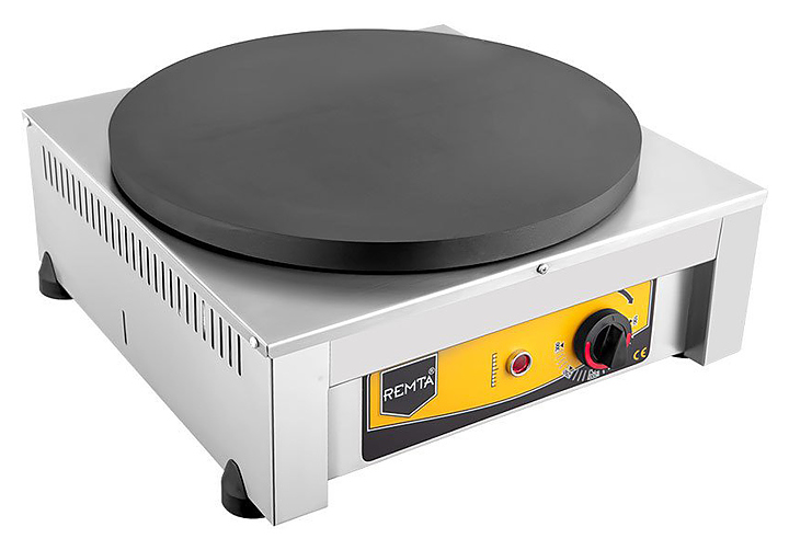 Блинница Remta KR1 предназначена для приготовления блинов на предприятиях общественного питания и торговли. Модель оснащена терморегулятором и индикатором включения. Корпус выполнен из нержавеющей стали, жарочная поверхность имеет тефлоновое покрытие.