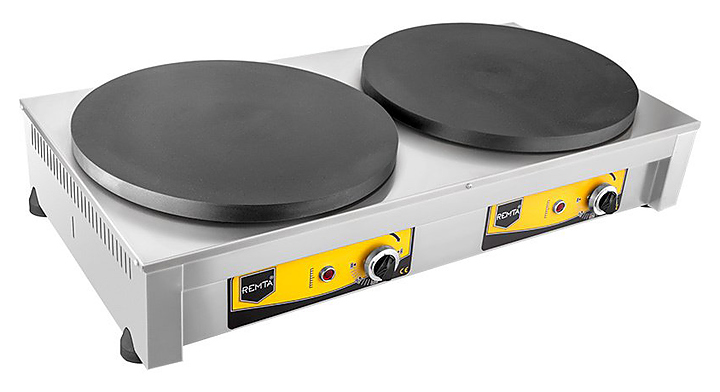 Блинница Remta KR2 предназначена для выпекания блинов на предприятиях общественного питания и торговли. Модель оснащена терморегулятором и индикатором включения. Корпус выполнен из нержавеющий стали, жарочная поверхность имеет тефлоновое покрытие.