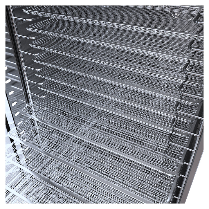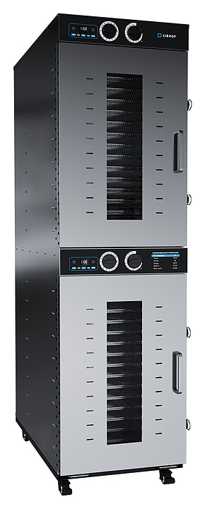 Дегидратор Libhof FDT-32D используется на предприятиях пищевой промышленности, общественного питания и торговли для сушки овощей, фруктов, ягод, грибов и трав, вяления рыбы, расстойки теста, приготовления сухариков, пастилы и йогурта. Модель оснащена 2 независимыми камерами с 16 уровнями направляющих для размещения поддонов в каждой камере, распашными дверьми с вертикальными рукоятками, расположенными в задних стенках вентиляторами и нагревательными элементами, кабелем питания и электромеханическими панелями управления. Корпус и поддоны выполнены из высококачественной нержавеющей стали.