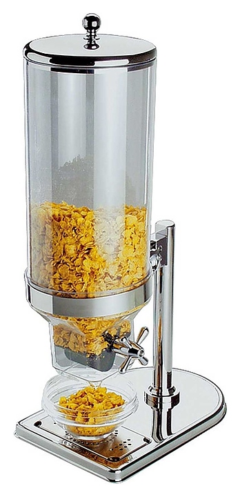 Диспенсер APS 11805 используется на предприятиях общественного питания и торговли для порционной раздачи сыпучих продуктов, таких как мюсли или кукурузные хлопья. Модель оснащена съемным контейнером. Корпус выполнен из нержавеющей стали, емкость - из поликарбоната.