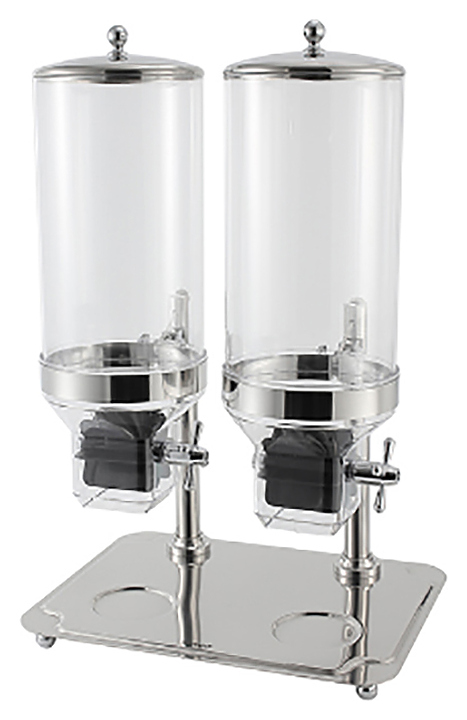 Диспенсер Kingo 10302 используется на предприятиях общественного питания и торговли для порционной раздачи сыпучих продуктов, таких как мюсли или кукурузные хлопья. Модель оснащена 2 емкостями. Корпус выполнен из нержавеющей стали, емкость - из пластика.
