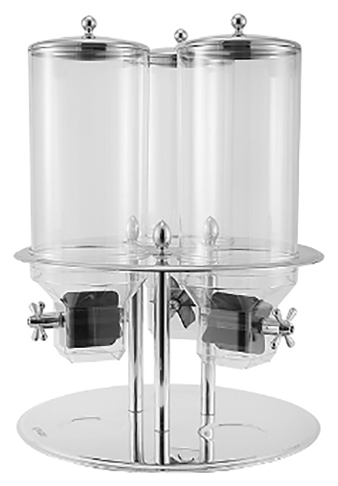 Диспенсер Kingo 10306 используется на предприятиях общественного питания и торговли для порционной раздачи сыпучих продуктов, таких как мюсли или кукурузные хлопья. Модель оснащена 3 емкостями. Корпус выполнен из нержавеющей стали, емкость - из пластика.