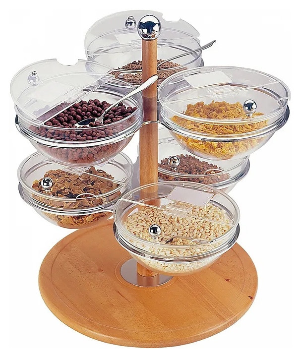 Диспенсер для мюсли и других мелких сухих продуктов Paderno 41401-60 используется на предприятиях общественного питания и торговли для хранения, демонстрации и последующей раздачи содержимого. Модель оснащена 6 вместительными емкостями круглой формы. Корпус и емкости выполнены из пластика, элементы корпуса-из нержавеющей стали.