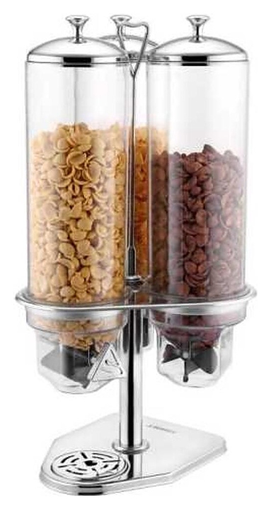 Диспенсер Sunnex X23577Х3 используется на предприятиях общественного питания и в домашних условиях для порционной раздачи сыпучих продуктов, таких как мюсли или кукурузные хлопья. Модель состоит из 3 емкостей с рукоятками и подставки. Изделия выполнены из прозрачного материала.