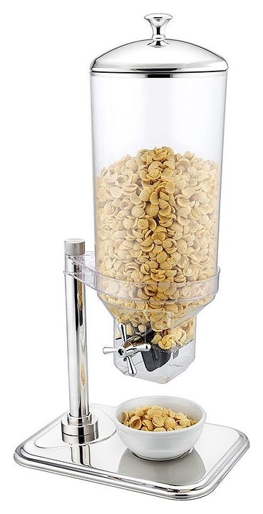Диспенсер Sunnex x23677 используется на предприятиях общественного питания и в домашних условиях для порционной раздачи сыпучих продуктов, таких как мюсли или кукурузные хлопья. Модель оснащена краном, крышкой и опорой с подставкой для тары. Опора, кран и крышка выполнены из металла с серебристой поверхностью, емкость – из прозрачного материала.