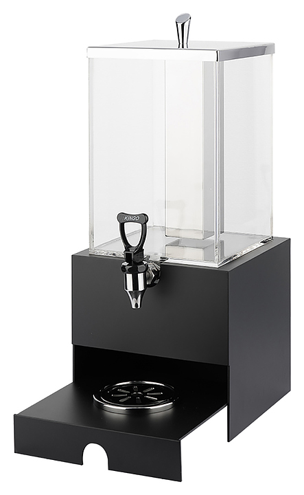 Диспенсер Kingo HOTEL F19401H-10B используется на предприятиях общественного питания и в домашних условиях для порционного розлива соков и других охлажденных напитков. Модель оснащена прямоугольной емкостью с краном для розлива, крышкой с ручкой, подставкой для тары и устойчивой опорой.