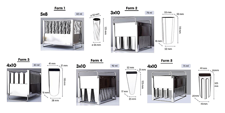 В комплект поставки входят 5 форм для беспрерывного производства мороженого.