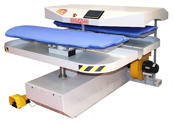 Принцип глажения состоит в поочередном прижиме гладильных столов с уложенным на них бельем к нагретой верхней гладильной плите, пока один стол прижат - происходит процесс глажения, в это время на втором столе оператор раскладывает другое белье. По окончании глажения первый стол опускается, как только оператор нажимает педаль - столы меняются местами. Процесс глажения повторяется для второго стола. Выглаженное белье заменяется новым, и цикл повторяется.