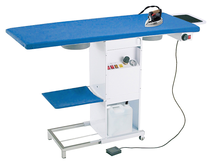 Профессиональный гладильный стол EOLO TS-02 используется в прачечных, отелях, гостевых домах и отелях для глажки белья и одежды. Модель оснащена сменным многослойным высокотемпературным чехлом, большой подставкой для парогенератора, полкой для белья, термореле, автоматическим наполнением бойлера из емкости с водой и колесиками для перемещения.