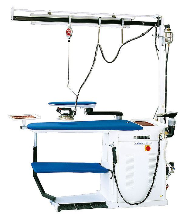 Профессиональный гладильный стол Ghidini Vapor используется в прачечных, отелях, гостевых домах и отелях для глажки белья и одежды. Модель оснащена встроенным парогенератором, поворотной рукавной формой с вакуумом и наддувом и нагревом, блоком подсветки с подвеской утюга и поворотной подставкой для утюга.
