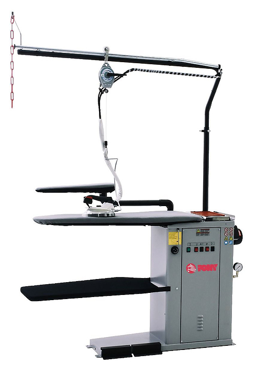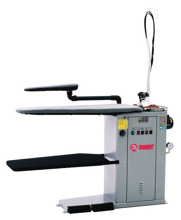 Гладильный стол PONY FVC-S используется в прачечных образовательных, оздоровительных заведениях, производственных предприятиях, в поликлиниках, гостиницах, детских садах, общежитиях, больницах, роддомах для глажения фасонного белья с помощью утюга. Стол оснащен паровым утюгом, аспиратором и поддувом, который дает возможность питать от него второй утюг, расположенный на радом стоящем столе.