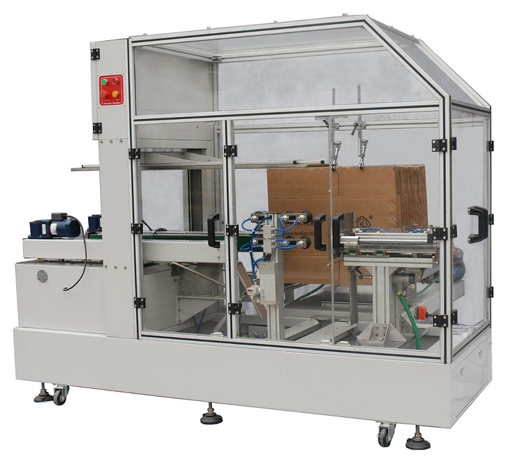 Сборщик коробов Hualian CXJ-5035C используется на предприятиях различных отраслей для автоматического формирования упаковочных картонных коробов из заготовок. Принцип работы: предварительно загруженная в магазин картонная вырубка захватывается специальным механизмом, затем происходит формирование прямоугольника корпуса, складывание нижних створок и герметизация дна клейкой лентой. Модель оснащена защитным кожухом с распашными дверьми и электромеханической панелью управления.