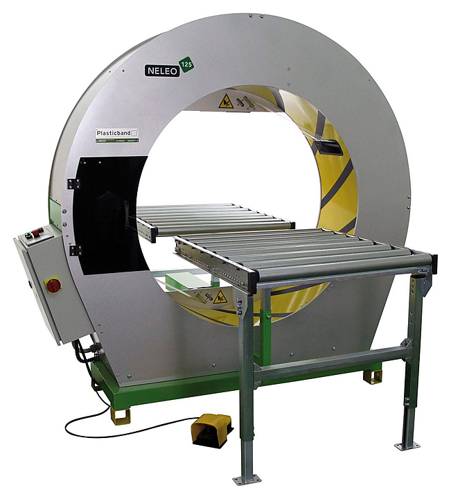 Гравитационный конвейер с роликами ПВХ Plasticband испоьзуется соместно с упаковочной машиной Neleo 125 для упаковки, группировки и защиты длинномерных изделий, таких как молдинги, профили, алюминиевые трубы и жалюзи в стрейч-пленку на предприятиях различных направлений.