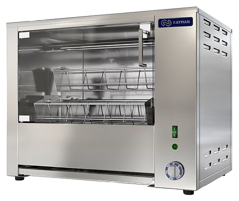 Гриль для кур KAYMAN ГЭ-4C8 A используется на предприятиях общественного питания и торговли для жарки тушек кур, цыплят, куриных окорочков, грудок и других продуктов питания. Модель оснащена 4 легкосъемными садками (люльками), вращающимися вокруг центральной оси внутри рабочей камеры, и ТЭНами, расположенными на передней, задней и верхней частях рабочей камеры. Корпус выполнен из пищевой нержавеющей стали AISI 430, садки для кур - из нержавеющего прутка, двери - из закаленного термостойкого ударопрочного стекла.