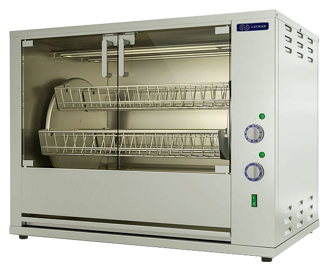 Гриль для кур KAYMAN ГЭ-6С18-Т A используется на предприятиях общественного питания и торговли для жарки тушек кур, цыплят, куриных окорочков, грудок и других продуктов питания. Модель оснащена 6 легкосъемными садками (люльками), вращающимися вокруг центральной оси внутри рабочей камеры, и ТЭНами, расположенными на передней, задней и верхней частях рабочей камеры. Корпус выполнен из пищевой нержавеющей стали AISI 430, садки для кур - из нержавеющего прутка, двери - из закаленного термостойкого стекла.