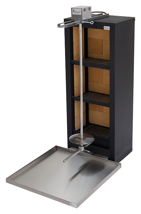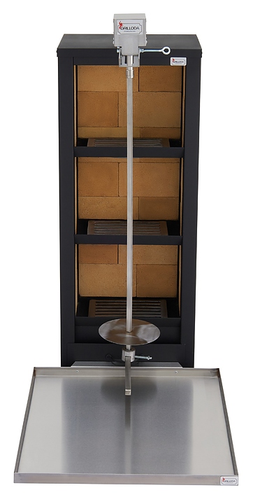 Универсальный вертикальный угольный аппарат GRILLODA ШУМ-3 предназначен для приготовления шаурмы и шашлыка с использованием углей на предприятиях общественного питания и торговли. Корпус выполнен из жаропрочной антикоррозийной стали, покрытой термостойкой краской, выдерживающей нагрев до 1200 °С, внутренняя отделка - из огнеупорного шамотного кирпича, шампур и поднос - из нержавеющей стали.