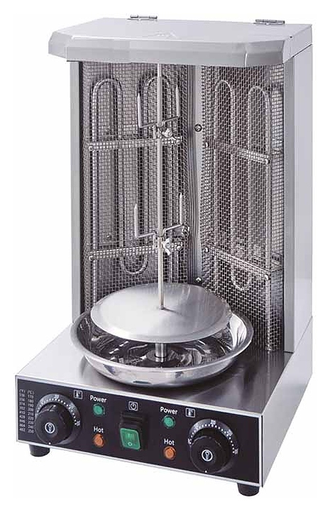 Гриль Kocateq GH 3DKE предназначен для обжарки большого количества различных видов мяса и птицы при приготовлении начинки для шаурмы, донера и других блюд на предприятиях общественного питания и торговли. Размещение на вертикальном вертеле обеспечивает равномерное приготовление. Модель оснащена 2 группами ТЭНов, расположенными справа и слева от спицы, механическими термостатами и съемным лотком для сбора жира. Корпус выполнен из нержавеющей стали, которая отличается прочностью и долговечностью.