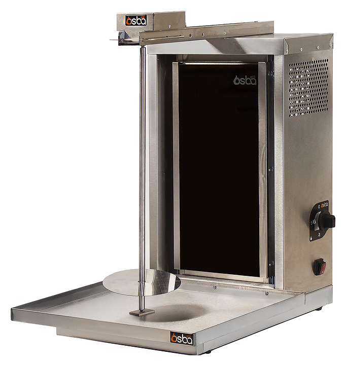 Гриль для шаурмы Osba 3.2S предназначен для обжарки большого количества различных видов мяса и птицы для приготовления начинки для шаурмы, донера и других блюд на предприятиях общественного питания и торговли. Модель оснащена 2 нагревательными элементами и керамическим стеклом для защиты спирали от попадания масла. Корпус выполнен из нержавеющей стали AISI 304.