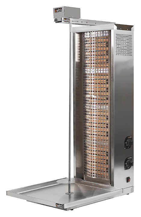 Гриль для шаурмы Osba 3.4KT предназначен для обжарки большого количества различных видов мяса и птицы для приготовления начинки для шаурмы, донера и других блюд на предприятиях общественного питания и торговли. Модель оснащена 4 нагревательными элементами и защитной сеткой. Корпус выполнен из нержавеющей стали AISI 304.
