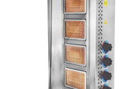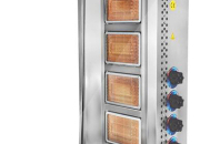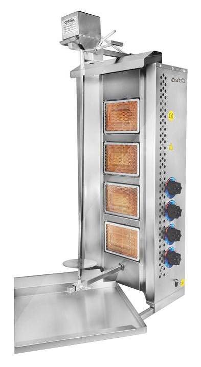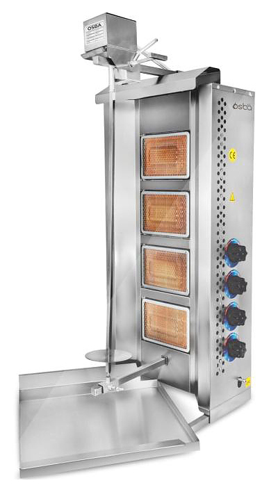 Газовый гриль Osba UST-04G предназначен для обжарки большого количества различных видов мяса и птицы при приготовлении начинки для шаурмы, донера и других блюд на предприятиях общественного питания и торговли. Размещение на вертикальном вертеле и электрическое управление вращением обеспечивают равномерное приготовление. Модель оснащена 4 зонами нагрева, каждая из которых управляется своим вентилем. Система с 2 направляющими вертела вперед и назад позволяет регулировать расстояние между мясом и нагревом при разном количестве заготовки. Корпус выполнен из нержавеющей стали, которая отличается прочностью и долговечностью.