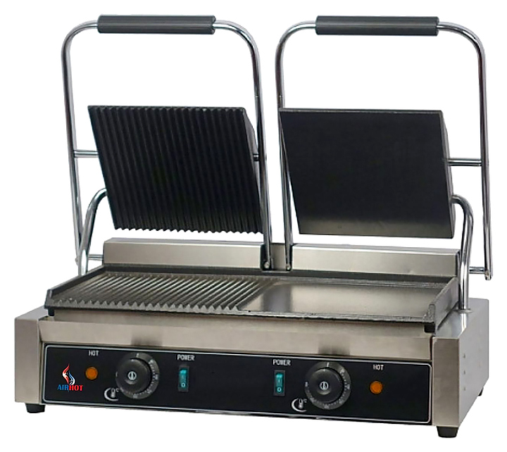 Прижимной гриль Airhot DCG-FFG предназначен для жарки мяса, птицы, рыбы, овощей, а также для приготовления стейков, гамбургеров и горячих сэндвичей на предприятиях общественного питания и торговли. Высокая скорость приготовления достигается благодаря встроенным в обе части аппарата тепловым элементам, которые плотно прилегают к продукту. Модель оснащена терморегулятором и съёмным поддоном для сбора жира и крошек. Корпус выполнен из нержавеющей стали, жарочная поверхность - из чугуна с антипригарным покрытием.