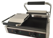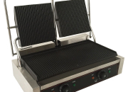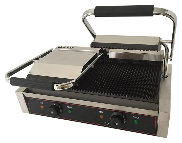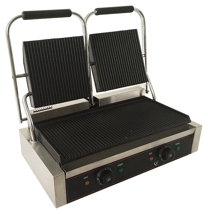 Прижимной гриль Airhot DCG предназначен для жарки мяса, птицы, рыбы, овощей, а также для приготовления стейков, гамбургеров и горячих сэндвичей на предприятиях общественного питания и торговли. Высокая скорость приготовления достигается благодаря встроенным в обе части аппарата тепловым элементам, которые плотно прилегают к продукту. Модель оснащена терморегулятором и съёмным поддоном для сбора жира и крошек. Корпус выполнен из нержавеющей стали, жарочная поверхность - из чугуна с антипригарным покрытием.