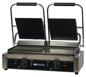 Прижимной гриль Hurakan HKN-PE44MT предназначен для обжаривания стейков и сосисок, приготовления сэндвичей, полуфабрикатов, подогрева булочек, гамбургеров, хот-догов на предприятиях общественного питания и торговли. Высокая скорость приготовления достигается благодаря встроенным в обе части аппарата тепловым элементам, которые плотно прилегают к продукту. Модель оснащена регулируемыми термостатами, индикаторами нагрева и лотком для сбора жира. Корпус выполнен из нержавеющей стали.