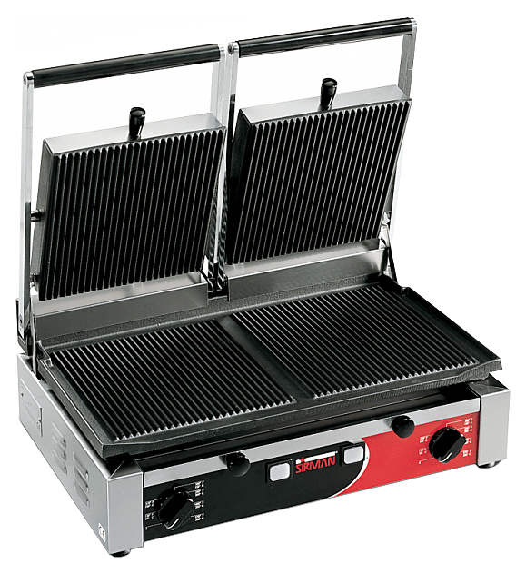 Прижимной гриль Sirman PD RR-RR предназначен для жарки мяса, птицы, рыбы, овощей, а также для приготовления стейков, гамбургеров и горячих сэндвичей на предприятиях общественного питания и торговли. Модель оснащена электромеханической панелью управления с 2 поворотными регуляторами температуры и световым индикатором нагрева, регулируемыми по высоте резиновыми ножками. Рабочие поверхности выполнены из чугуна с антипригарным покрытием.