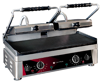 Прижимной гриль Tatra TCG 5224 R R R+R предназначен для жарки мяса, птицы, рыбы, овощей и быстрого разогрева полуфабрикатов на предприятиях общественного питания и торговли. Модель оснащена электромеханической панелью управления с терморегулятором и индикаторами питания и нагрева, системой независимого управления каждой зоной нагрева, 2 раздельными верхними поверхностями и емкостью для сбора жира. Корпус выполнен из нержавеющей стали.