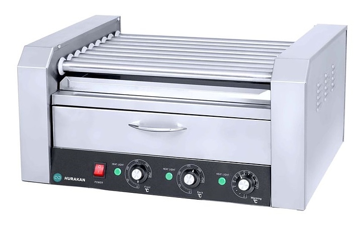 Роликовый гриль Hurakan HKN-GW9H предназначен для обжаривания сосисок и сарделек, мясных и рыбных рулетов на предприятиях общественного питания и торговли. Модель оснащена отделением для подогрева булочек. Корпус и ролики выполнены из нержавеющей стали.