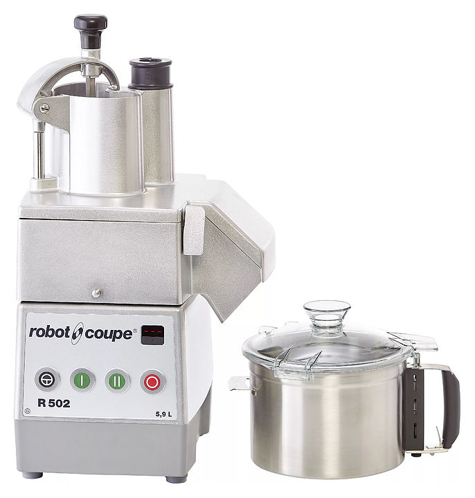 Кухонный процессор Robot Coupe R502G используется на предприятиях общественного питания и торговли для всех видов нарезки, замешивания и измельчения продуктов питания. Насадка-овощерезка оснащена 2 воронками: полукруглой и цилиндрической. Аппарат представляет собой куттер и овощерезку в одном виде. Корпус мотора выполнен из металла, чаша и лезвия - из нержавеющей стали.