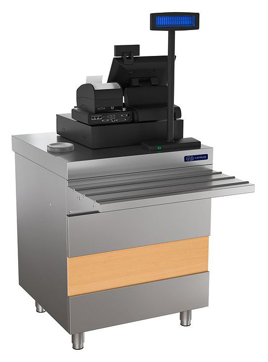 Кассовый прилавок KAYMAN ПК-700-02 используется в составе линии раздачи PRESTO на предприятиях общественного питания и торговли для оборудования рабочего места продавца-кассира. Модель оснащена розеткой для подключения кассового аппарата, направляющей для подносов и регулируемыми по высоте опорами. Корпус, столешница и направляющая для подносов выполнены из нержавеющей стали AISI 430, столешница усилена листом ЛДСП, ножки - из нержавеющей стали, опоры ножек - из пластика.