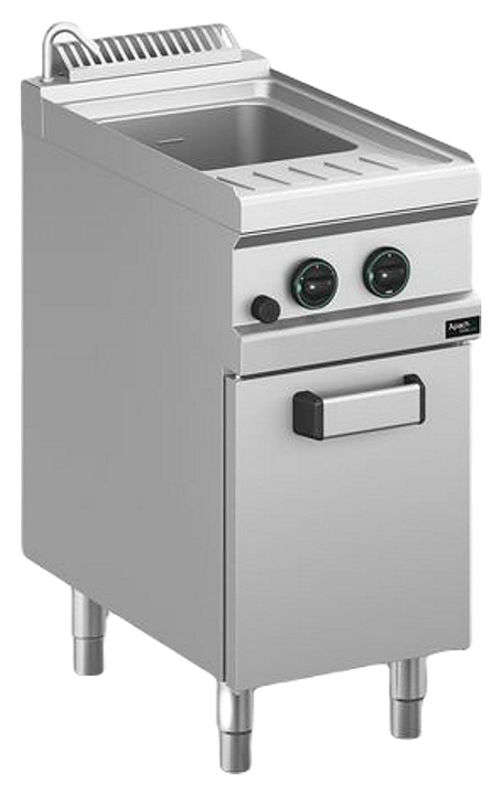 Макароноварка Apach APPG-47P/PL 700-й серии используется на предприятиях общественного питания и торговли для приготовления спагетти, пасты и прочих изделий из теста. Модель оснащена закрытым шкафом с распашной дверцей, электромеханической панелью управления с терморегулятором и таймером и горелками с пьезоэлектрическим поджигом и системой стабилизации пламени. Корпус, рабочая поверхность, панель управления и вытяжная решетка выполнены из нержавеющей стали AISI 304, дверца, боковые и задние панели - из нержавеющей стали AISI 430, ванна - из нержавеющей стали AISI 316, нагревательные элементы - из нержавеющей стали.