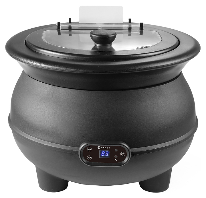 Мармит HENDI 860502 предназначен для поддержания постоянной температуры первых блюд на предприятиях общественного питания. Оборудование позволяет избежать остывания и последующего подогрева блюд, негативно сказывающихся на вкусовых качествах. Модель оснащена съемкной крышкой с изолированной ручкой и выемкой для половника, емкостью для воды, цифровой сенсорной панелью, отображающей поочерёдно заданную и текущую температуру и устойчивыми ножками. Корпус выполнен из полипропилена, внутренняя ёмкость - из нержавеющей стали 18/8, крышка - из прозрачного поликарбоната, емкость для воды - из алюминия.