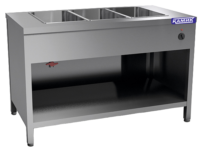 Мармит КАМИК МУ-12070 используется на предприятиях общественного питания и торговли для кратковременного хранения, демонстрации и поддержания в теплом состоянии супов, гарниров, вторых блюд и соусов. Модель оснащена ванной с 2 делителями и полкой-дном. В правой части закрытой с 3 сторон конструкции расположен термостат, позволяющий регулировать температуру. Корпус выполнен из нержавеющей стали AISI 430.