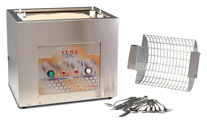Машина Vema AP2091/E используется на предприятиях общественного питания и торговли для полировки, дезинфекции и и стерилизации натуральным образом столовых приборов. Модель выполнена из нержавеющей стали.
