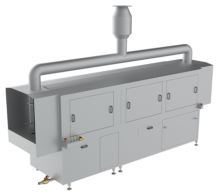 Тоннельная машина Азимут ММТТ-300 предназначена для мойки и дезинфекции оборотной пластиковой тары в производственных цехах. Процесс очистки состоит из основной мойки и ополаскивания. Модель оснащена высокопроизводительны насосом, распыляющим моющий раствор через форсунки, Корпус выполнен из нержавеющей стали AISI 304.