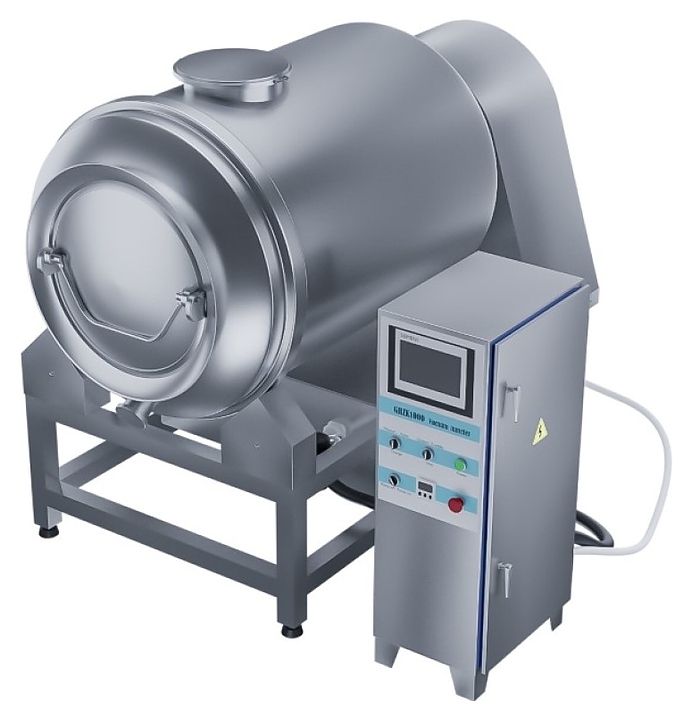 Вакуумный массажер Hualian GRZK1000 используется на предприятиях общественного питания и торговли для массирования мяса, рыбы или птицы в процессе маринования и посола. Модель оснащена современным PLC-контроллером, регулируемой скоростью вращения барабана и сенсорной панелью управления. Массажер выполнен из высококачественной пищевой нержавеющей стали.