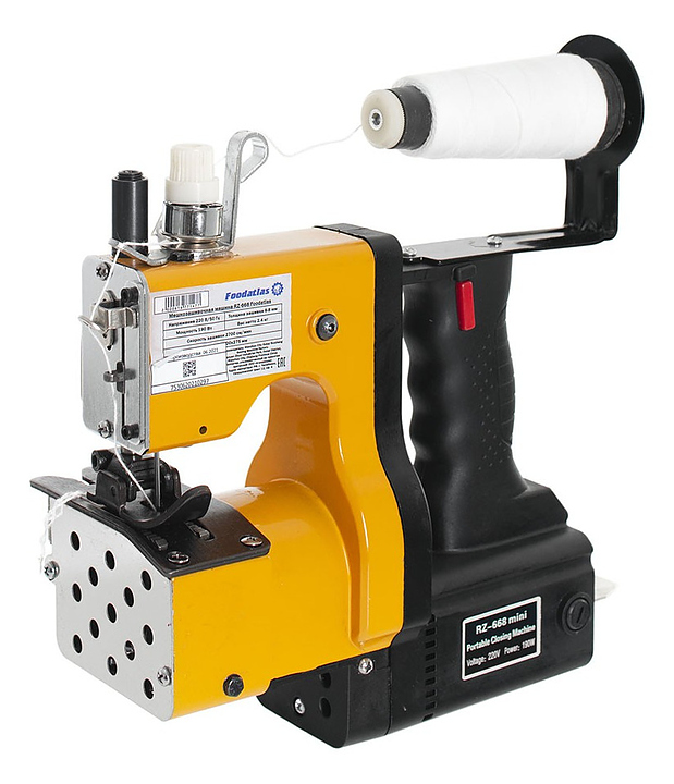 Мешкозашивочная машина Foodatlas RZ-668 используется на предприятиях общественного питания и торговли для прошивания полипропиленовых, полиэтиленовых, джутовых, тканевых и бумажных мешков. Модель оснащена системой обрезки нити, эргономичной рукоятью с удобным расположением кнопки запуска, имеет дополнительные крепления для подвеса, при помощи которых машинку можно подвесить. Также модель оборудована внешним переносным элементом питания (аккумулятором), который соединен с основным корпусом при помощи гибкого кабеля, аккумулятор крепится к поясному ремню оператора, что снижает нагрузку на его руку. Копрус выполнен из стали и покрыт порошковой краской.