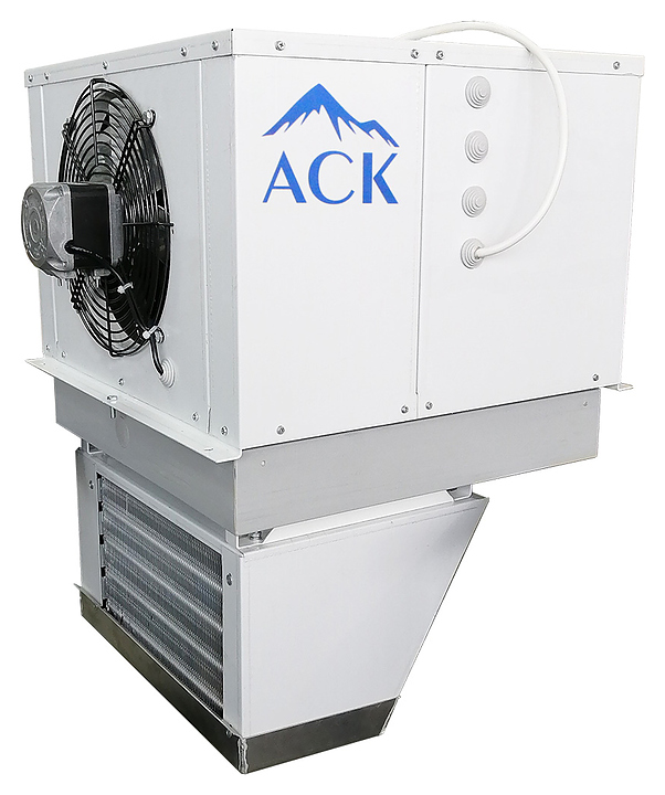 Среднетемпературный потолочный моноблок АСК-Холод МСп-12 предназначен для поддержания необходимого температурного режима в холодильных камерах на предприятиях пищевой промышленности, общественного питания и торговли. Модель выполнена в виде единого блока, воздухоохладитель (испаритель) которого устанавливается во внутренний объем холодильной камеры, а компрессорно-конденсаторный блок - снаружи. Корпус изготовлен из оцинкованной стали белого цвета толщиной от 0,9 до 1,2 мм с полимерным покрытием, трубы конденсатора и испарителя - из меди, ребра - из алюминиевого сплава.