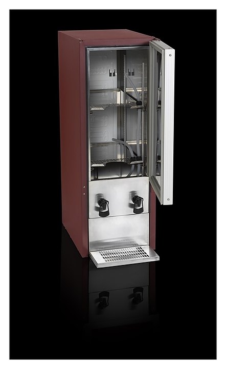Диспенсер для вина TEFCOLD DKS95-2/20L используется в барах, ресторанах, специализированных магазинах, на других предприятиях общественного питания и торговли для розлива вина в упаковке BiB (Tetra Pak) при оптимальной температуре. Модель оснащена холодильной камерой с глухой распашной дверью, 2 полками и 2 кранами. Внутренняя облицовка и полки выполнены из высококачественной нержавеющей стали марки SS304, экстерьер корпуса с покрытием красного оттенка (RAL3005).