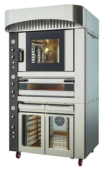 Комбинированный модуль Kocateq FR Combi M предназначен для выпечки хлебобулочных и кондитерских изделий и приготовления различных блюд на предприятиях пищевой промышленности, общественного питания и торговли. Модель состоит из конвектомата, подовой печи, расстоечного шкафа и вытяжного зонта. Корпус выполнен из нержавеющей стали, дверца - из двойного закаленного стекла.