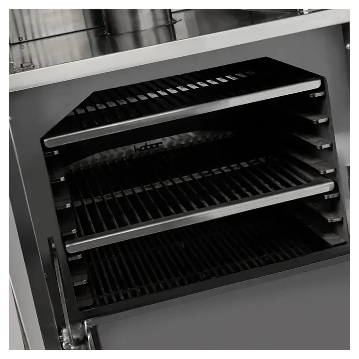 Печь-мангал Кобор FIRE-45-L BC предназначена для приготовления блюд на углях на предприятиях общественного питания. Модель оснащена подставкой и полкой для подогрева. Корпус выполнен из нержавеющей стали AISI430, камера и колосниковая решетка - из жаростойкой котловой стали толщиной 5 мм, дверь и некоторые элементы имеют черное полимерное покрытие.