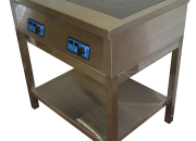 Индукционная плита ЦМИ ПИ-2(5) предназначена для приготовления различных блюд в наплитной посуде на предприятиях общественного питания и торговли. Нагрев рабочей поверхности осуществляется моментально, вследствие чего затрачивается меньшее количество электроэнергии. Корпус, каркас подставки и полка выполнены из нержавеющей стали AISI 430 толщиной 0,8 мм, верхний контур - из нержавеющей стали AISI 430 толщиной 1,5 мм, ножки - из нержавеющей трубы 40х40х1,2 мм, конфорка - из жаропрочного стекла толщиной 5 мм.