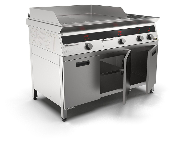 Комбинированная индукционная плита SMART INDUCTION K76-3RPKN предназначена для приготовления и быстрого разогрева блюд на предприятиях общественного питания и торговли. Модель оснащена электронно-механической панелью управления с цифровой индикацией и сенсорными кнопками, 3 съемными жировыми фильтрами для отделения жира и влаги от поступающего внутрь аппарата воздуха, 2 ящиками для сбора жира и регулируемыми по высоте ножками. Корпус и столешница выполнены из нержавеющей стали AISI430, рабочая поверхность плиты - из стеклокерамики, рабочая поверхность гриля и передняя панель - из нержавеющей стали.